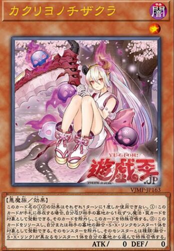 VJMP-JP163 カクリヨノチザクラ暗 惡魔 1星 效果 0/0每回合只能使用這個卡名的①②效果各1次。①:這張卡存在於手牌的場合,以雙方墓地各1張魔法 · 陷阱卡為對象才能發動。除外對象卡牌,特殊召喚這張卡。②:釋放這張卡,以雙方墓地任1隻融合、同步、超量或者連…